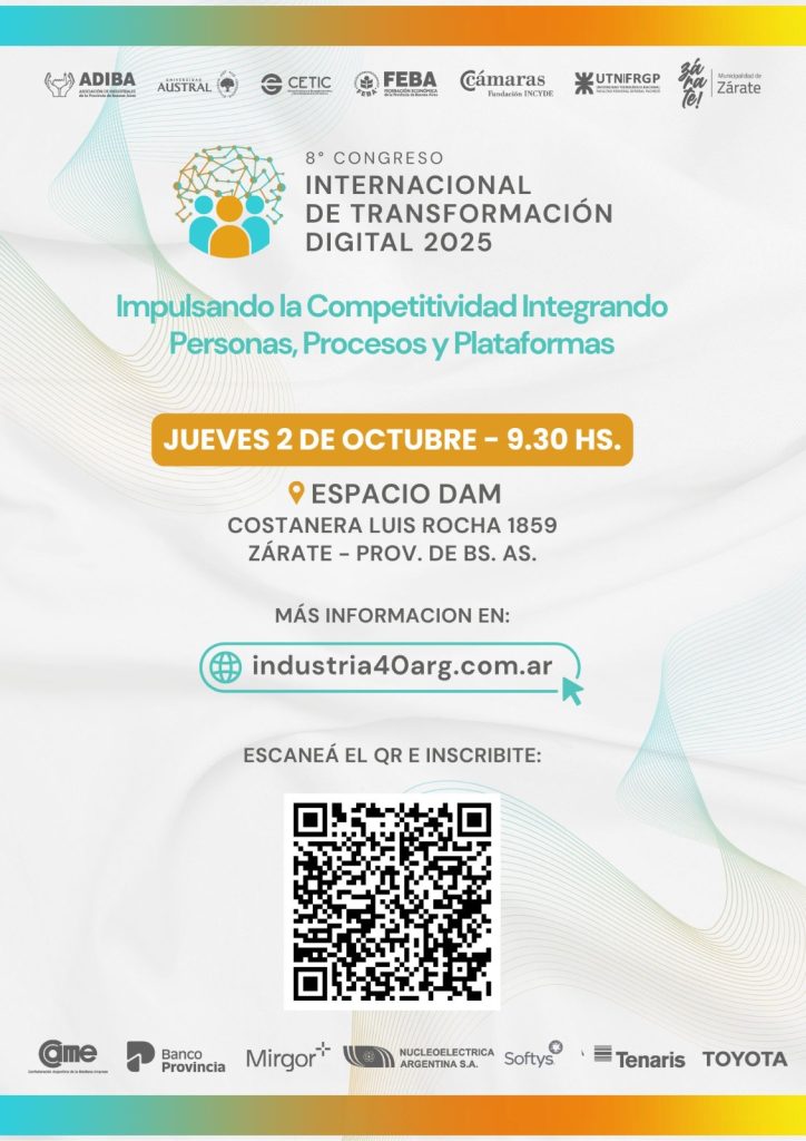 Este jueves 2 de octubre a las 9:30 horas, en el Espacio DAM de Zárate, se llevará a cabo el “8º Congreso Internacional de Transformación Digital: Impulsando la competitividad integrando personas, procesos y plataformas”, un encuentro que se ha consolidado como referente nacional e internacional en innovación y competitividad industrial. El evento es organizado por ADIBA, la Universidad Austral, CETIC, FEBA, la Fundación Incyde, la UTN-FRGP y la Municipalidad de Zárate.