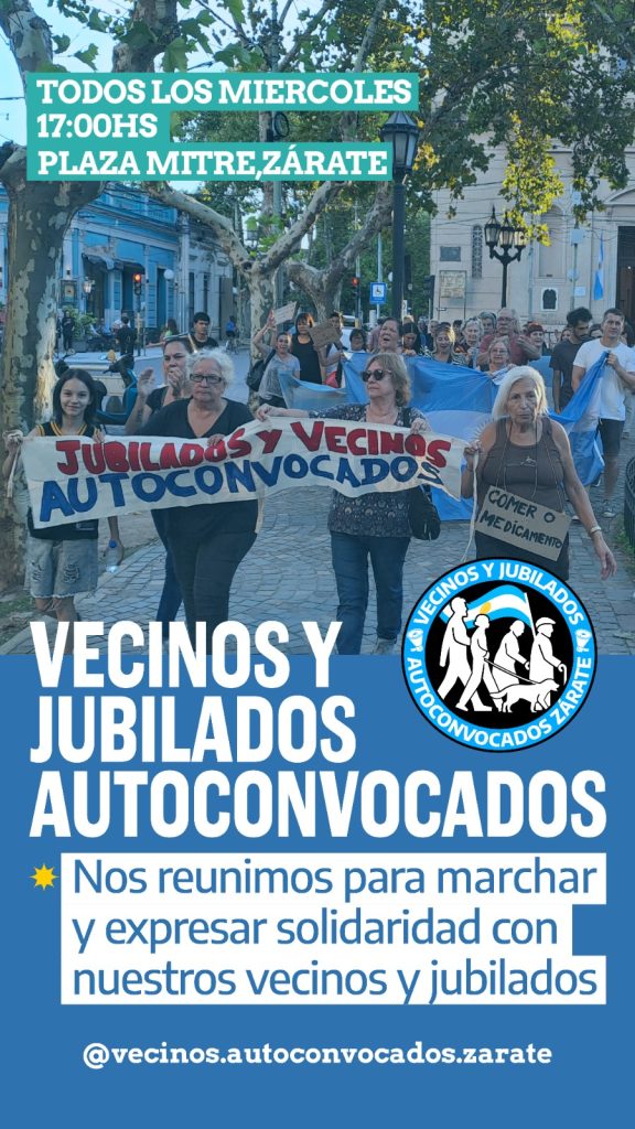 Por sexta semana consecutiva, los vecinos y jubilados de Zárate se convocan en la Plaza Mitre para marchar y expresar su solidaridad con sus pares, convencidos de que “nadie puede vivir dignamente con jubilaciones mínimas de 350.000 pesos”. Así lo expresó esta mañana en Radio Omega, Inés Verón, una de las promotoras de este encuentro en defensa de los derechos y la dignidad de las personas mayores. La reunión de vecinos se realizará, como cada miércoles, alrededor de las 17:00 horas. Compartimos la entrevista completa realizada por Mario Teti y Fanny Vega.